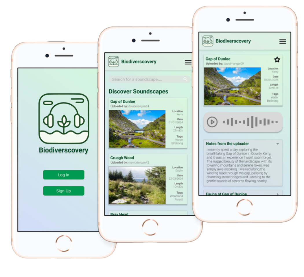Initially, the concept focused on creating a platform to log local flora and fauna. However, during my research, I identified the National Biodiversity Data Centre as a comprehensive resource for biodiversity logging in Ireland. Recognizing the need for a more novel approach, I pivoted the project to focus on the experiential side of biodiversity—natural soundscapes. This change was driven by the potential to combine environmental engagement with the mental health benefits associated with nature sounds.